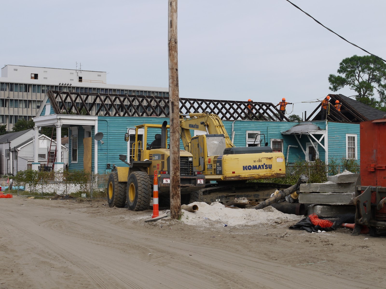 In the middle, workers began removing the distinctive, oddly-shaped roof on the fine aquamarine home at 222-24 S. Rocheblave. As you can see in the shot below, the recently-occupied building from about 1905-1910 has a great front porch facade, as well as an interesting rear side entry with metal overhang. I'm not certain if the rear wing will fit within the 60-foot maximum for moving.